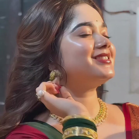 Elegant multi-color traditional saree featuring rich green, mustard yellow, and deep red hues with a luxurious gold zari border. Paired with a golden blouse, this saree offers a graceful festive look, perfect for weddings, celebrations, and cultural occasions. A beautiful blend of classic charm and vibrant elegance.