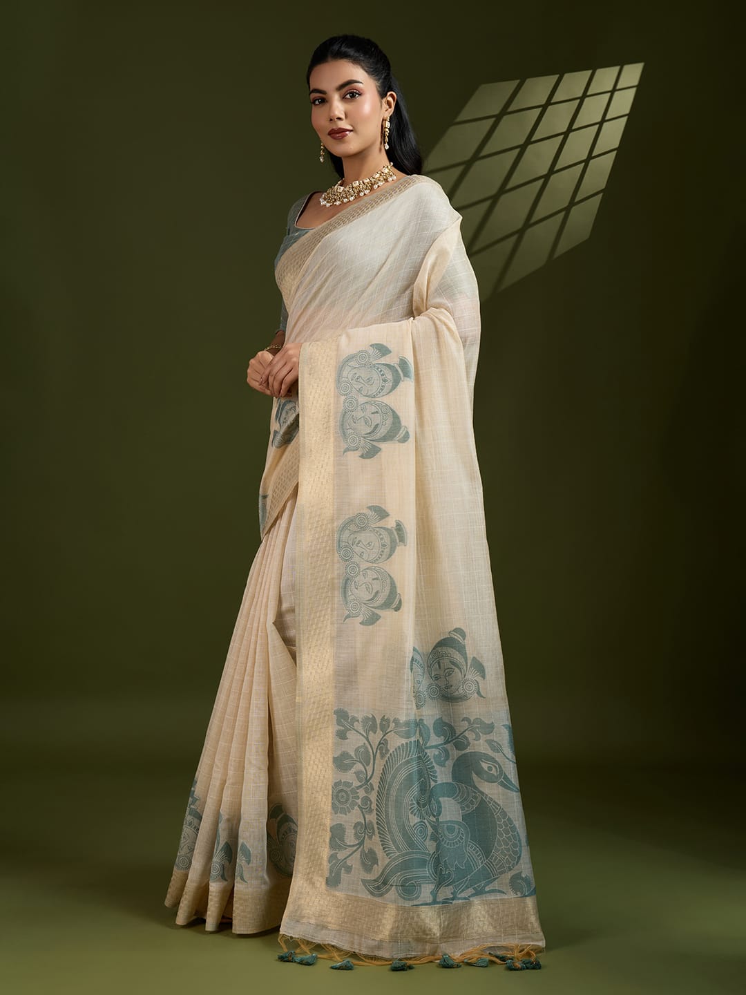 Premium soft Muga Cotton saree with traditional kalamkari peacock weaving pallu and weaving figures on border with all over checks woven pattern with fancy tassels and contrast blouse piece