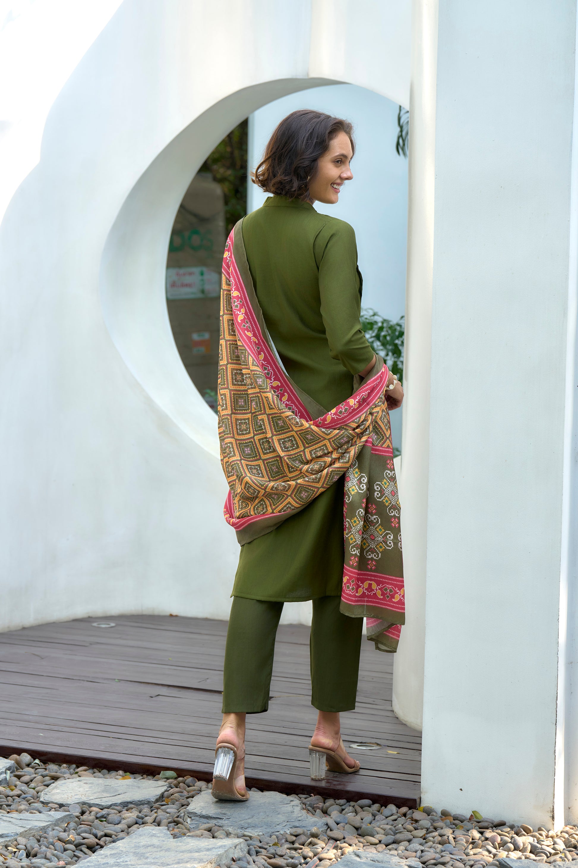 Olive Green Kurta Set with Geometric Printed Dupatta