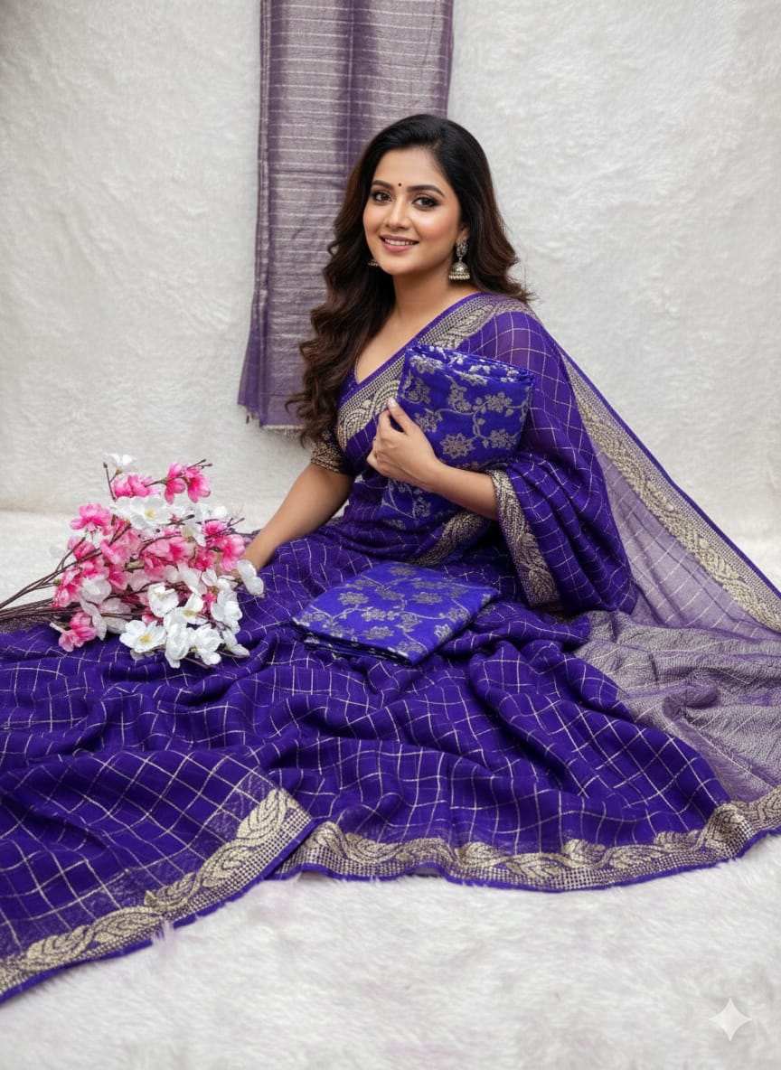 Pure Viscose Chinon Saree With Viscose contrast Blouse