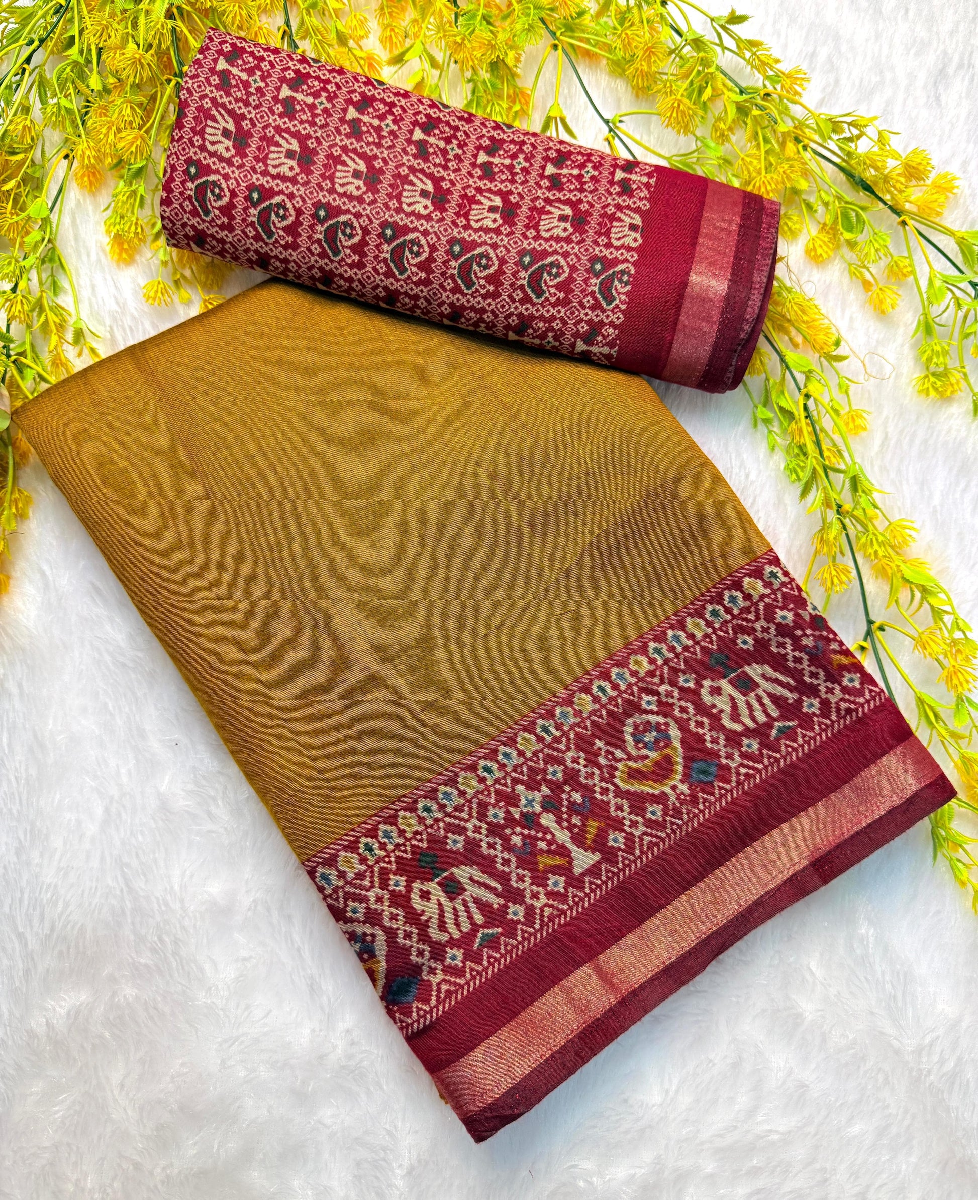Elevate your ethnic wardrobe with this elegant handloom-style saree featuring a rich mustard-yellow body beautifully complemented by a maroon Ikat-patterned border and pallu. The intricately woven motifs—elephants, peacocks, and traditional geometric designs—add a touch of cultural charm and sophistication.